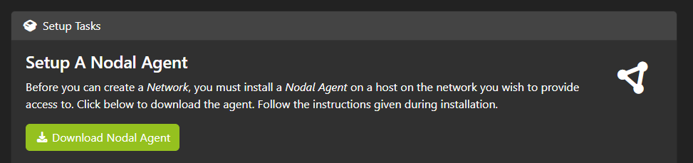 Whilst logged into your cloud tenant, the Dashboard should show some Setup Tasks for you. Click Download Nodal Agent in the Setup a Nodal Agent section.